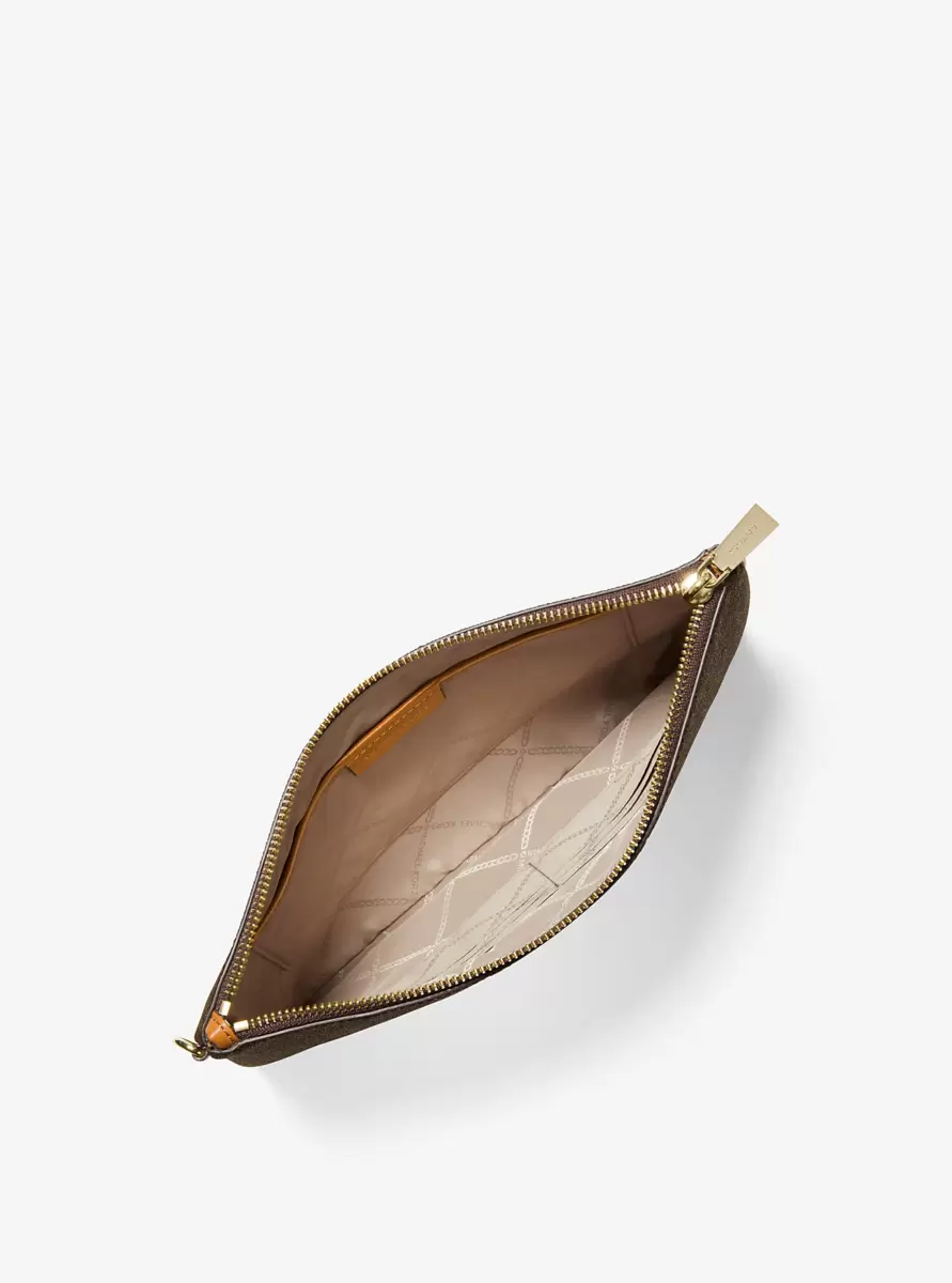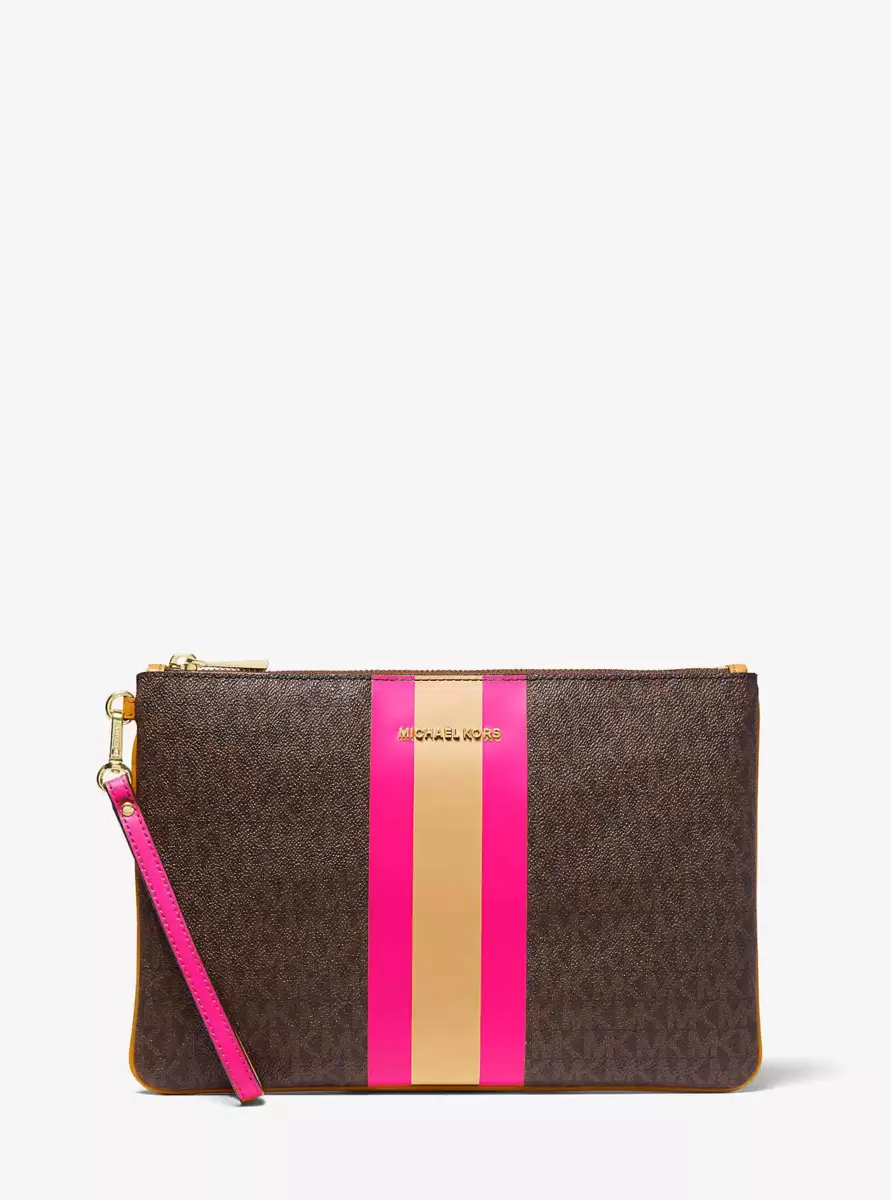 Unsere elegante Reißverschlusstasche präsentiert sich in neuem Gewand mit unserem charakteristischen Logoprint und kontrastierenden Mittelstreifen für einen modernen Look. Ausgestattet mit polierten Beschlägen und einer abnehmbaren Handschlaufe bietet dieses praktische Accessoire Platz für Ihr Smartphone, Ihre Karten, Bargeld und mehr.