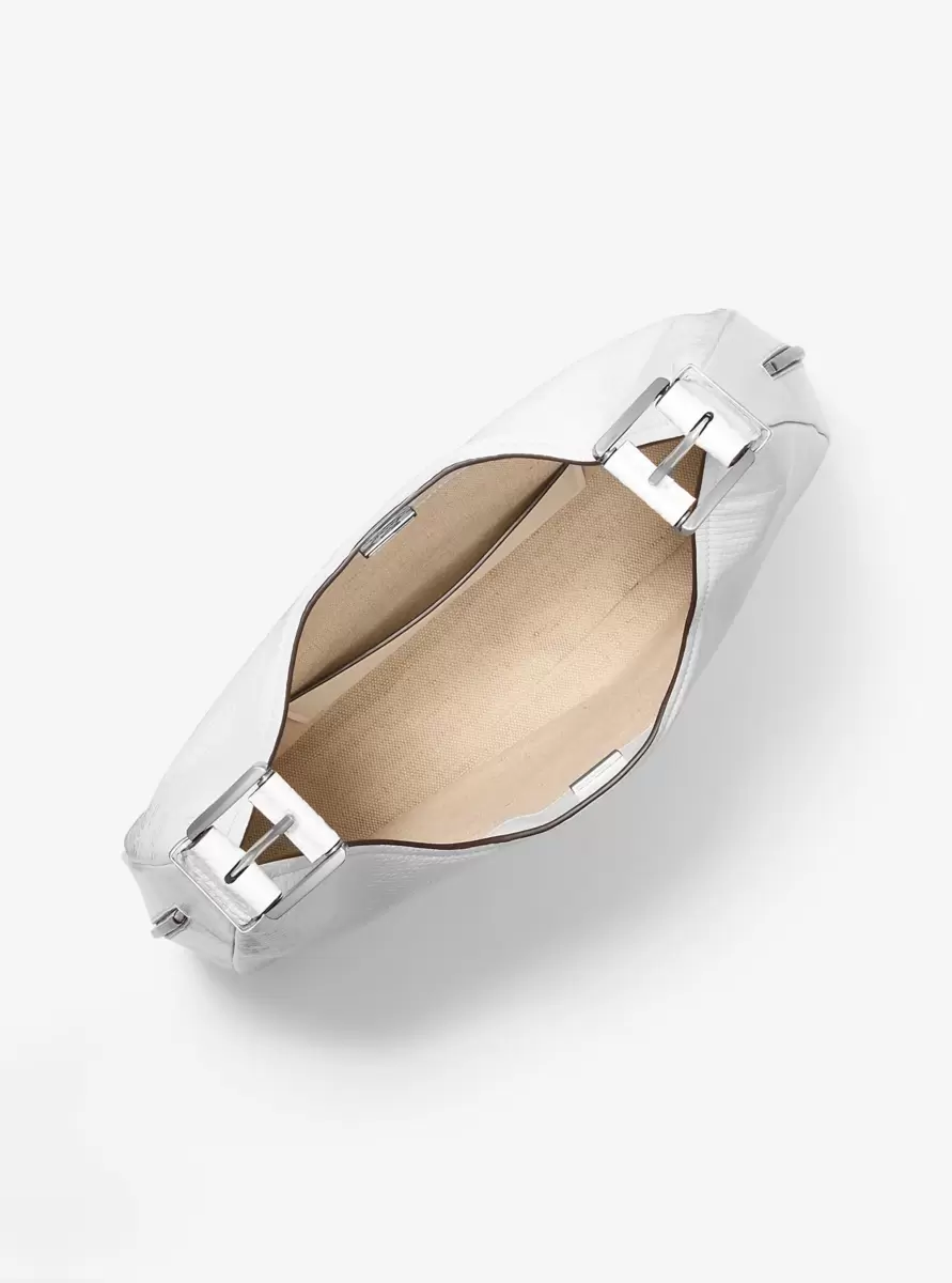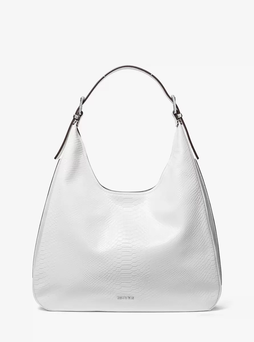 Die Nolita Hobo-Tasche aus Schlangenleder mit strukturierten Kanten, die ihre Form betonen, wirkt lässig und gleichzeitig elegant. Sie verfügt über einen verstellbaren Schulterriemen mit polierten Schnallen und ein geräumiges, offenes Innenfach für alles, was Sie brauchen.