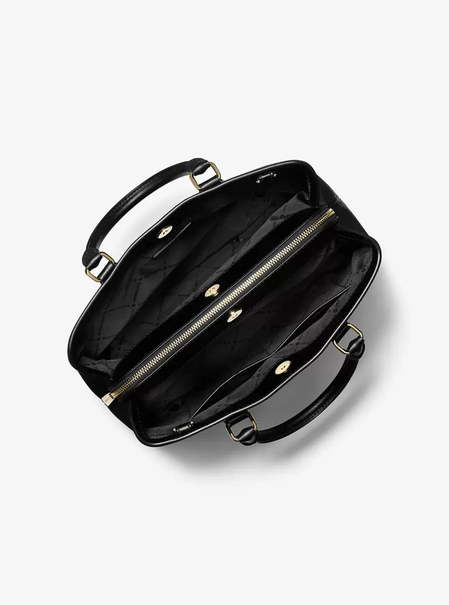Der Schlüssel zu eleganter Raffinesse. Die Camille Satchel besticht durch ihre glatte Oberfläche und vereint eine schlanke, elegante Silhouette mit einem edlen Schloss und Schlüssel – der Inbegriff von raffiniertem Glamour. Tragen Sie sie an den Tragegriffen oder lässig über der Schulter mit dem verstellbaren Schulterriemen für einen modernen Look. Kombinieren Sie sie mit Ihrem Lieblings-T-Shirt und Jeans für einen stilvollen Freizeitlook.
