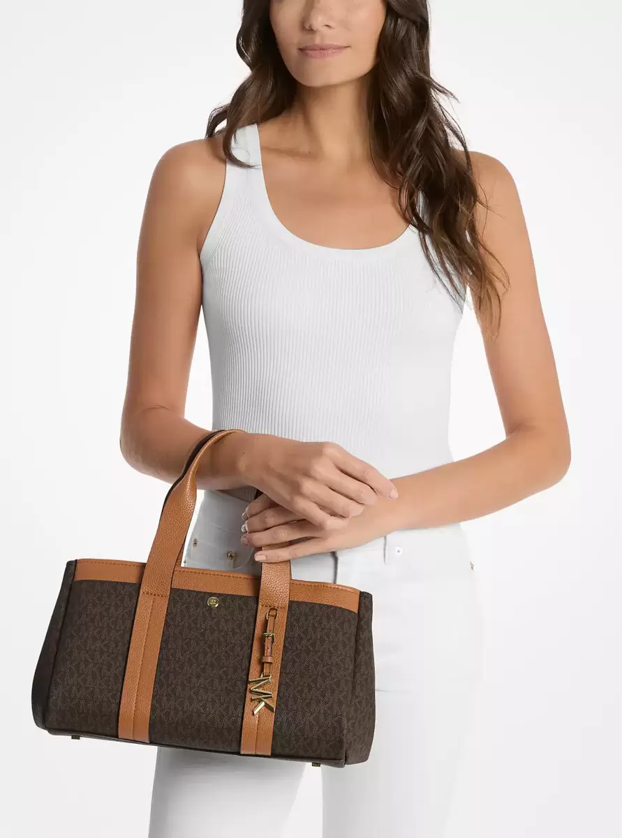 Unsere Romee-Tasche verkörpert modernen Glamour. Sie ist aus Canvas mit Signature-Print und Lederbesatz gefertigt und mit einem eleganten MK-Logo-Anhänger verziert. Die stabilen Tragegriffe lassen sich bequem über der Schulter tragen, während der Schulterriemen stilvolles Tragen ohne Hände ermöglicht.