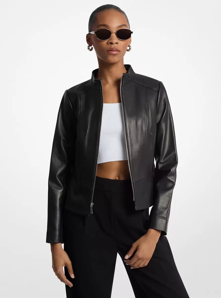 Mit dieser taillierten Lederjacke, die perfekt für Ihren nächsten Ausgehabend geeignet ist, bleiben Sie elegant. Ein dezenter Stehkragen, geradlinige Einsätze und ein Reißverschluss vorne verleihen dieser minimalistischen Silhouette eine moderne Note. Vervollständigen Sie den lässig-luxuriösen Look mit einer taillierten Hose oder dunkler Jeans.