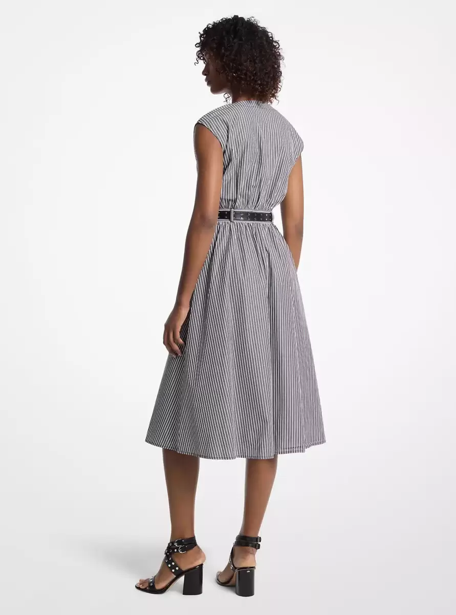 Dieses Midikleid ist das perfekte Outfit für warme Tage. Es hat eine klassische A-Linien-Silhouette, ist locker geschnitten, aus knitterfreiem Baumwollpopeline gefertigt und wird mit einem Nietengürtel geliefert, der die Taille betont. Kombinieren Sie die klassischen Streifen mit Accessoires im angesagten Retro-Stil.