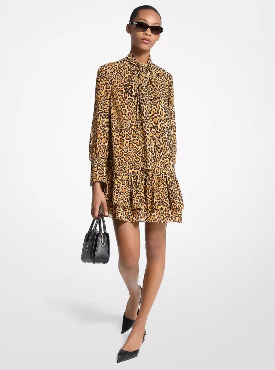 Kleid aus Georgette mit Leopardenmuster und Bindekragen
