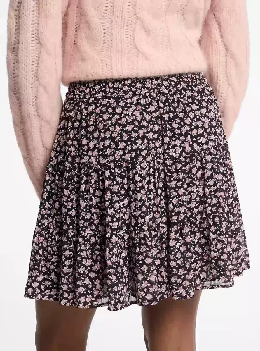 Ein Stufenrock mit floralem Print verleiht diesem Minirock feminine Eleganz, während polierte Nieten für einen raffinierten Akzent sorgen. Kombinieren Sie den luftigen Georgette-Rock mit einem kuscheligen Strickpullover und Ballerinas mit Nieten für ein stimmiges Outfit.