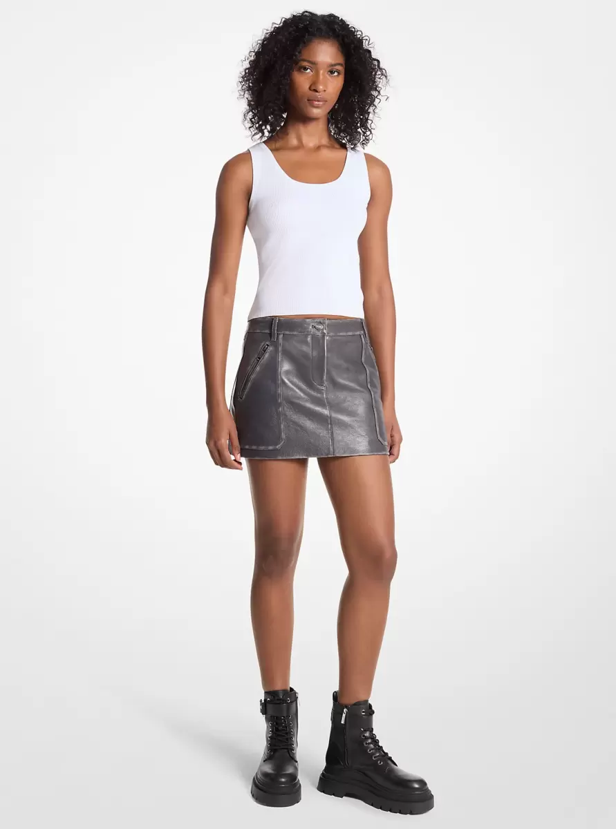Dieser vom Motorradstil inspirierte Rock ist aus geschmeidigem Leder mit einem verwaschenen Finish gefertigt, das ihm einen Vintage-Touch verleiht. Schräge Taschen und Ton-in-Ton-Nähte unterstreichen den Biker-Look. Kombinieren Sie den Minirock mit Combat Boots.