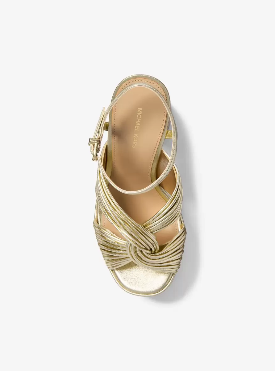 Verleihen Sie Ihrem Look mit unserer Plateau-Sandale Alessia einen Hauch von Retro-Glamour. Dieses elegante Modell setzt mit seinem glatten Metallic-Obermaterial und den strukturierten Riemen, die den Fuß umspielen und für einen zusätzlichen Hingucker sorgen, neue Maßstäbe. Kombinieren Sie die Sandale mit einem Minirock für Ihren nächsten Ausgehabend.