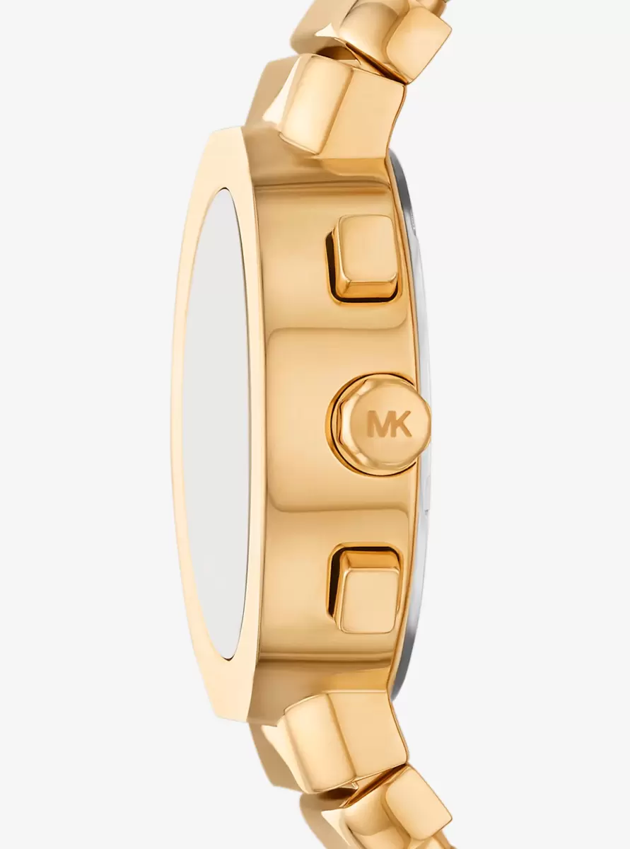 Ein moderner Klassiker: unsere funktionale Gramercy-Uhr. Gefertigt aus goldfarbenem Edelstahl, besticht dieses elegante Modell durch Chronographenzifferblätter und ein Armband mit ineinandergreifenden Elementen für einen interessanten Kontrast.