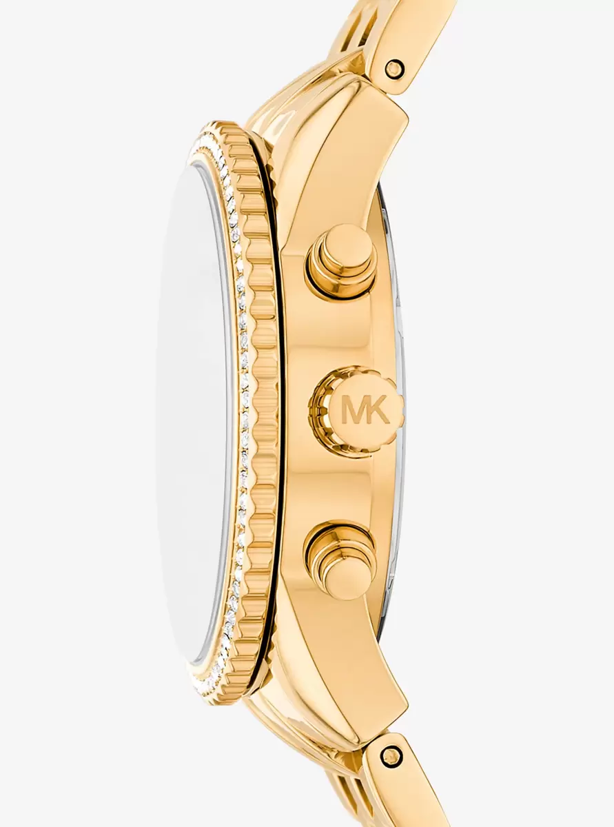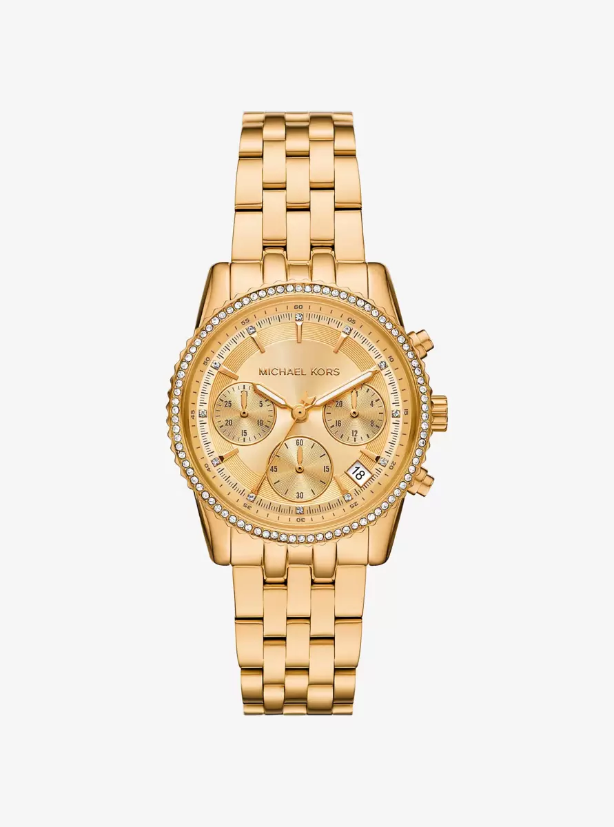 Die strahlende und elegante Bryant-Uhr vereint goldfarbenen Edelstahl mit einem von Herrenuhren inspirierten Armband zu einem schicken und zeitlosen Design. Die Chronographenanzeige sorgt für Funktionalität, während die mit Pavé-Fassungen besetzte Lünette einen Hauch von Glanz verleiht.