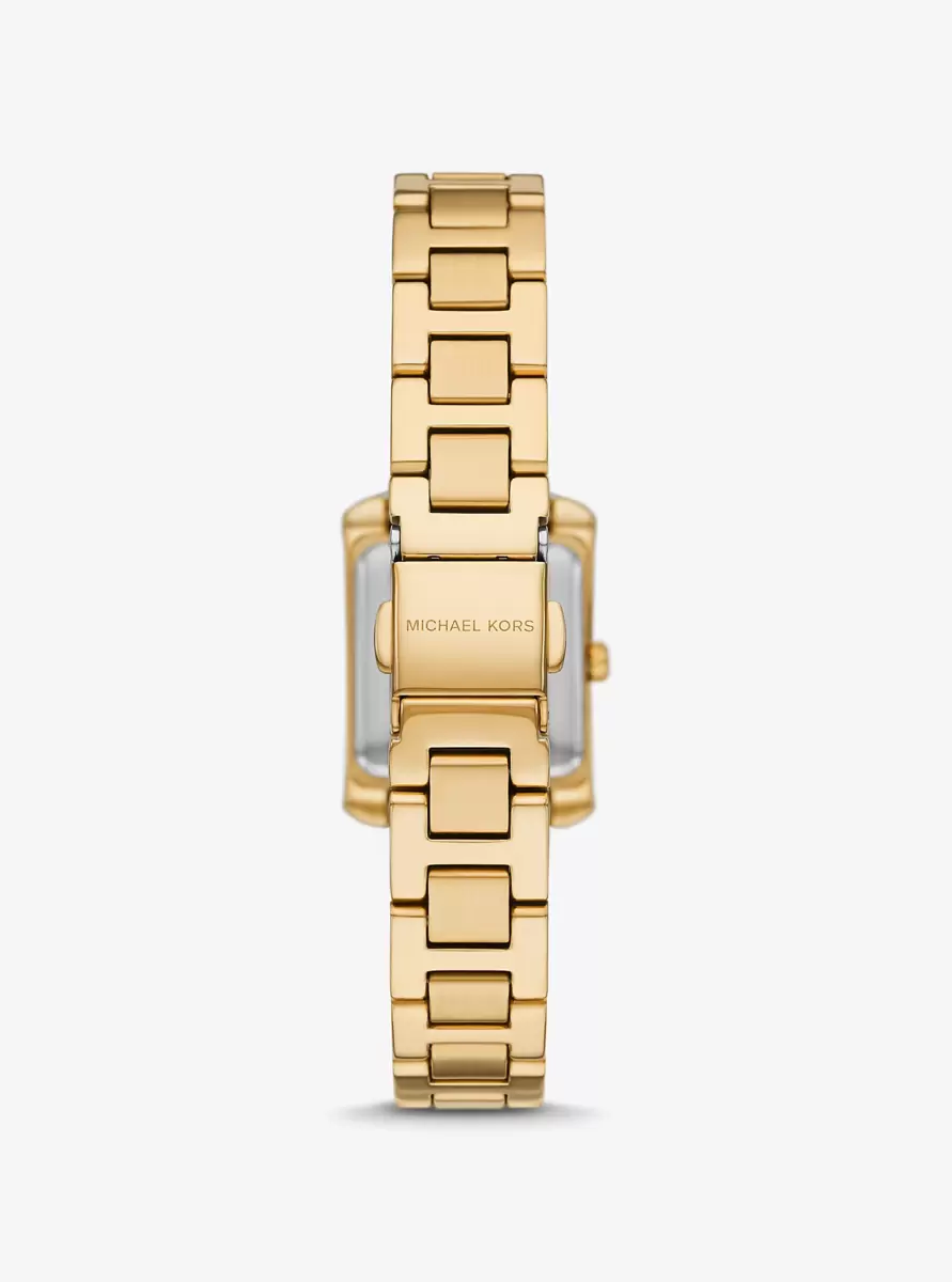 Zarte Linien aus Pavé-Kristallen verleihen dem rechteckigen Zifferblatt unserer Mini Emery Uhr einen funkelnden Glanz. Das polierte, abgeschrägte Armband ist aus goldfarbenem Edelstahl gefertigt, während das Zifferblatt mit römischen Ziffern für ein elegantes Finish sorgt. Glamourös genug für Abendgarderobe und gleichzeitig dezent genug, um ein schlichtes T-Shirt und Jeans perfekt zu ergänzen – ein zeitloser Klassiker, den Sie nie wieder ablegen möchten.