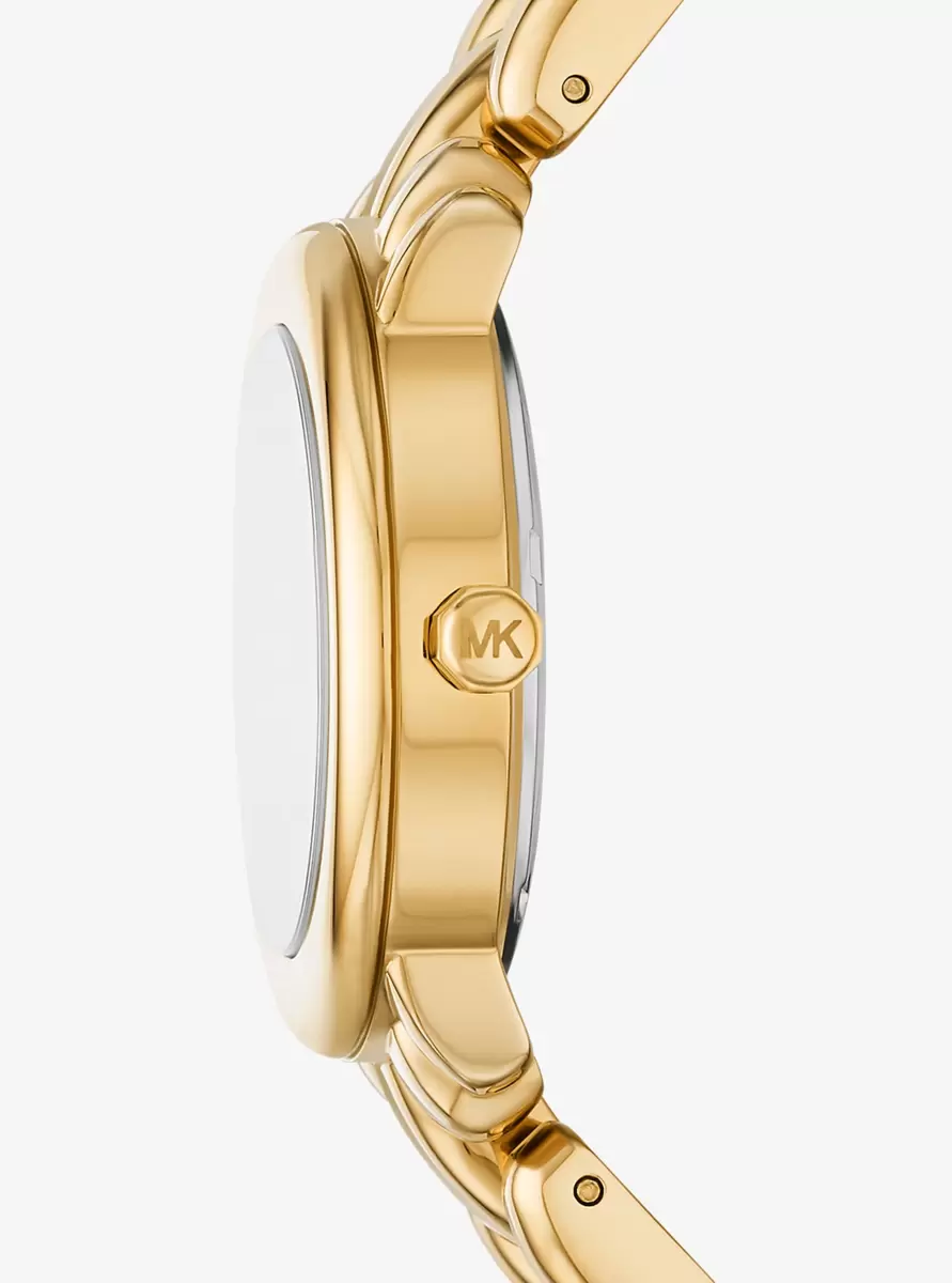Die elegante und skulpturale Phoebe-Uhr präsentiert unseren neuen MK Pop Charm auf dem Zifferblatt. Gefertigt aus goldfarbenem Edelstahl, besticht sie durch ein markantes, voluminöses Gliederarmband mit einem strahlenden Finish, das das Licht wunderschön einfängt. Tragen Sie sie als Statement-Piece sowohl im Büro als auch zu besonderen Anlässen.