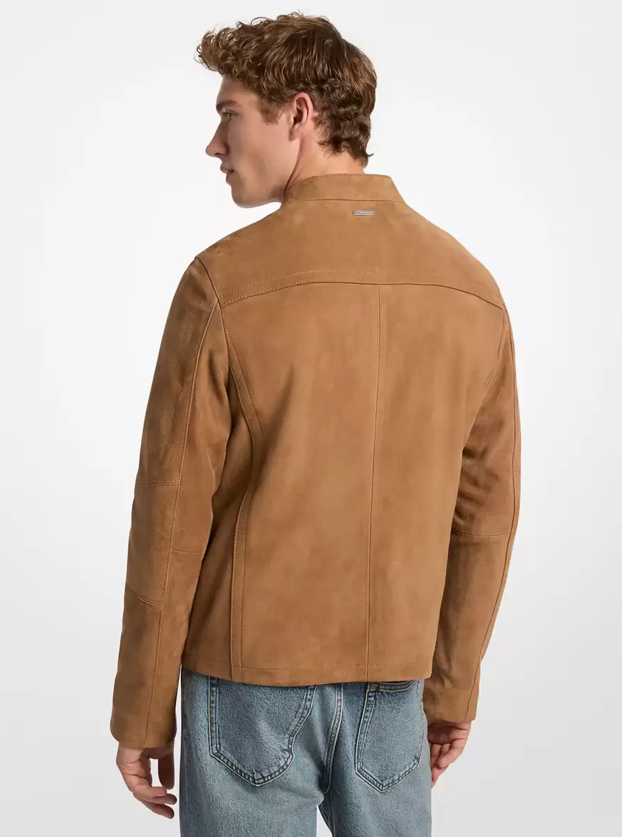 Diese Jacke besticht durch ihre edle Wildlederverarbeitung und die moderne Racerback-Silhouette. Der Stehkragen wird mit Druckknöpfen geschlossen, und zwei doppelte Reißverschlusstaschen bieten viel Stauraum. Verleihen Sie einem neutralen Look mit dieser Jacke das gewisse Etwas.