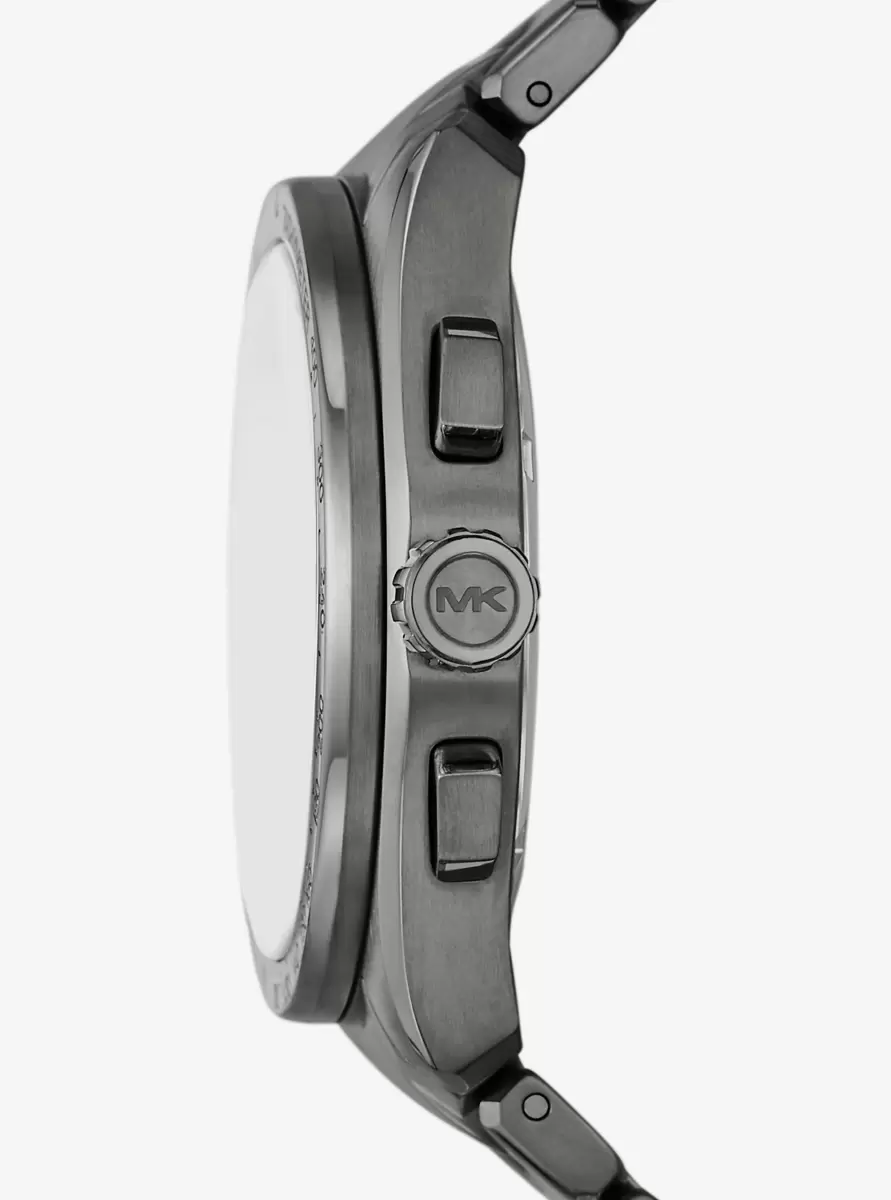 Lernen Sie die Accelerator 2.0 kennen. Gefertigt aus Edelstahl in Gunmetal-Optik, besticht dieses Oversize-Modell durch seinen markanten Look. Eine blau umrandete Lünette rahmt das sportliche Zifferblatt mit eleganten Stundenmarkierungen, Datumsanzeige und Chronographenfunktion ein.