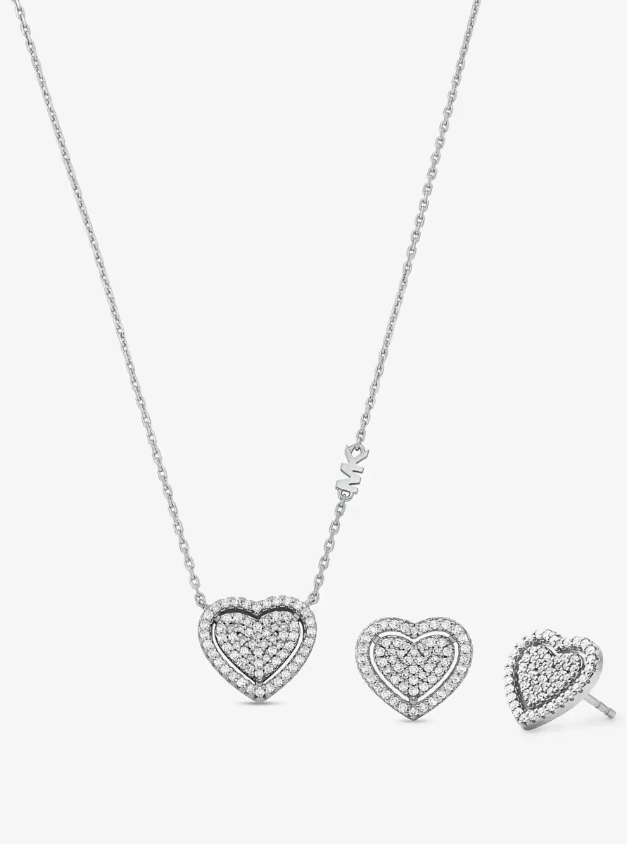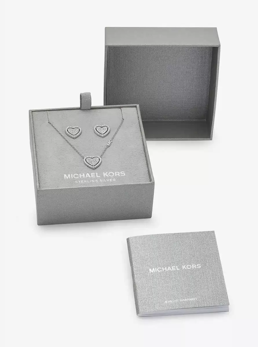 Ob zum Geburtstag, zu Weihnachten oder einfach so – überraschen und erfreuen Sie sie mit diesem funkelnden Geschenkset. Ein Herzanhänger und passende Ohrstecker, verziert mit glitzernden Pavé-Steinen, werden ihr garantiert zeigen, wie sehr Sie sie lieben. Beachten Sie den kleinen MK-Anhänger an der rhodinierten Sterlingsilberkette.