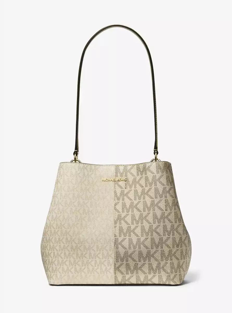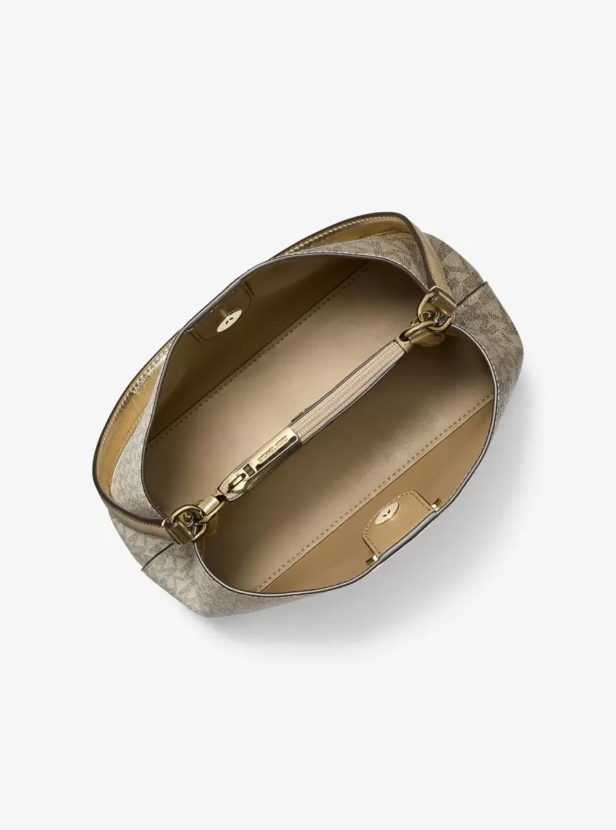 Pratt Medium Zweifarbige Metallic-Schultertasche mit charakteristischem Logo