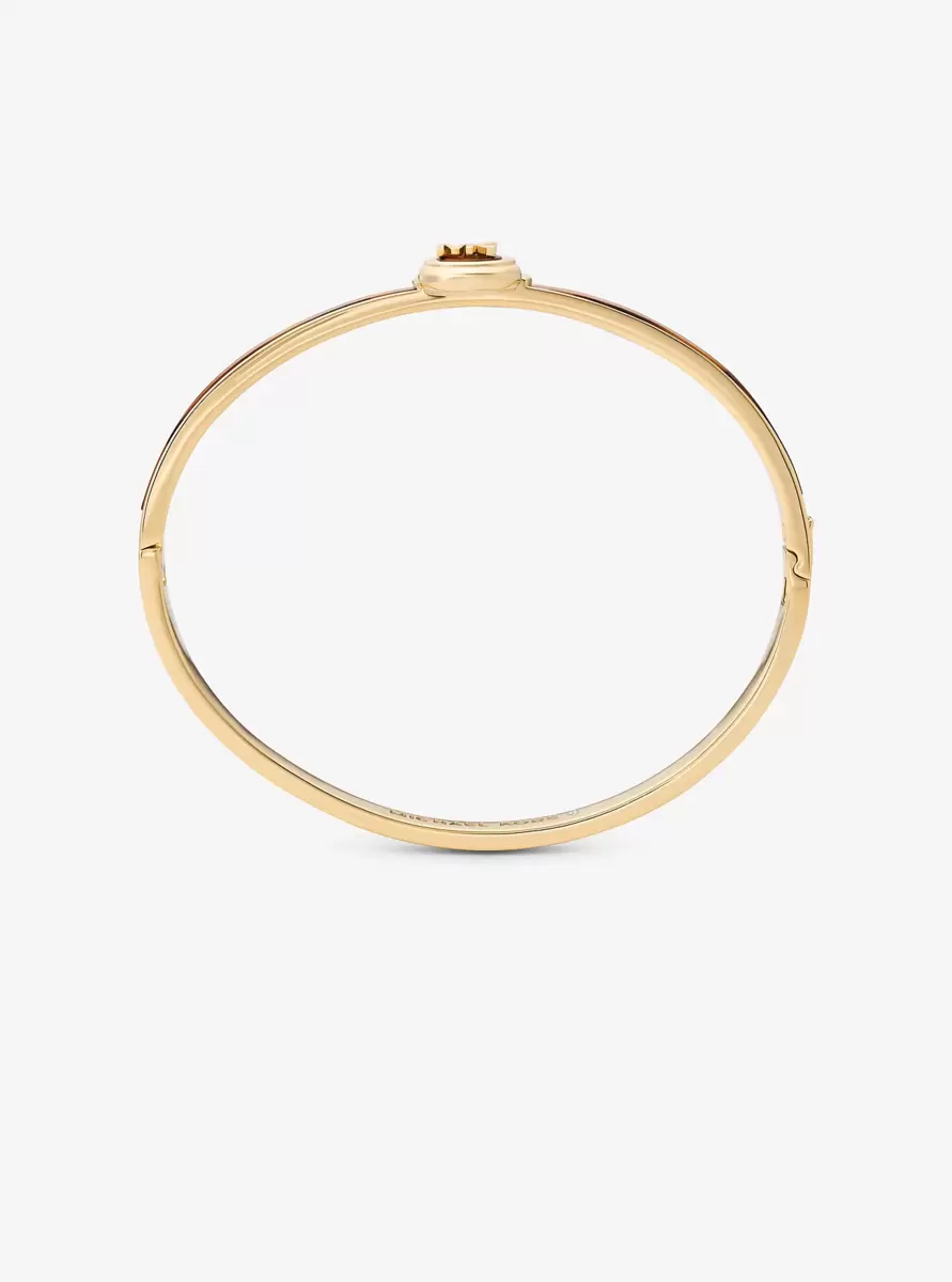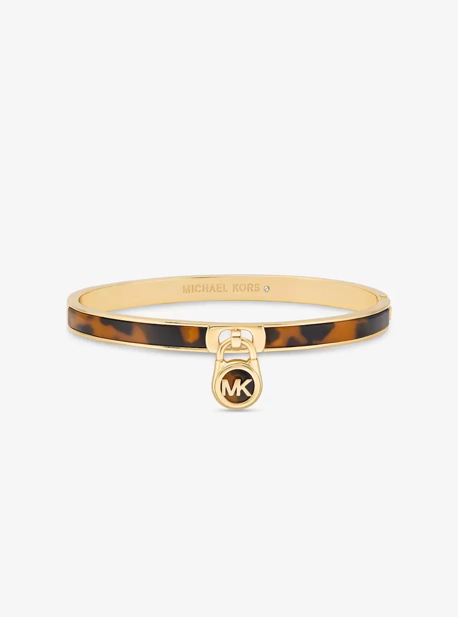 Dieses goldfarbene Armband mit einem Anhänger, der von den Beschlägen unserer beliebten Hamilton-Tasche inspiriert ist, ist mit Akzenten aus Schildpatt-Acetat verziert. Dank des Klappknopfverschlusses lässt es sich leicht an- und ablegen.