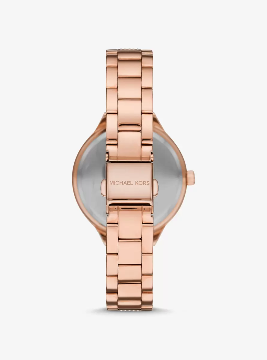 Unsere legendäre Slim Runway Uhr, ein Dauerbrenner, erhält ein funkelndes Update mit einem pavébesetzten Zifferblatt, einer Lünette und Mittelgliedern. Dieses ausdrucksstarke Modell ist aus roségoldfarbenem Edelstahl gefertigt und verfügt über minimalistische Zeitmarkierungen.