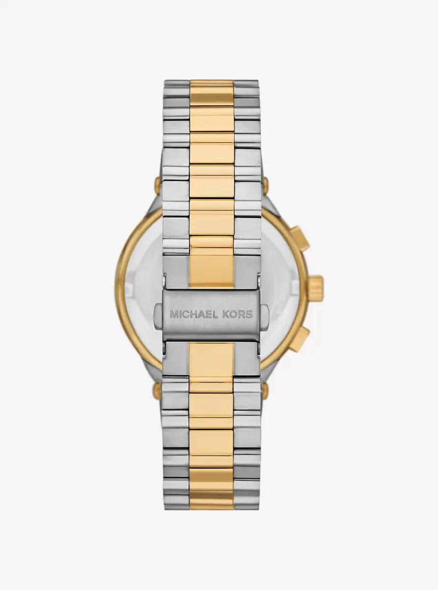 Klassische Eleganz trifft auf Moderne: Die übergroße Billie-Uhr besticht durch ihr strukturiertes, weißes Zifferblatt mit goldfarbenen römischen Ziffern. Gefertigt aus zweifarbigem Edelstahl, verfügt sie über ein elegantes Armband mit silber- und goldfarbenen Gliedern. Sie ist die perfekte Ergänzung für professionelle und lässige Outfits.
