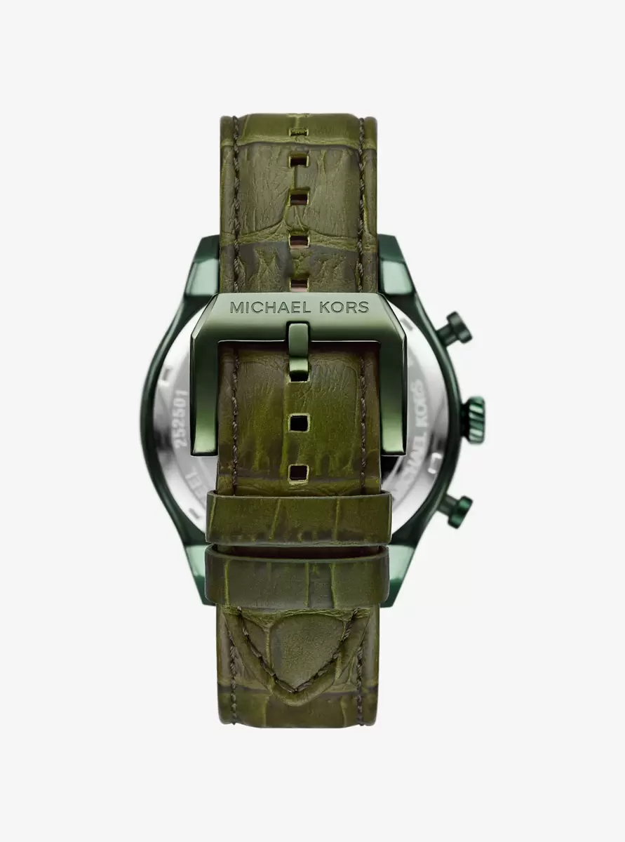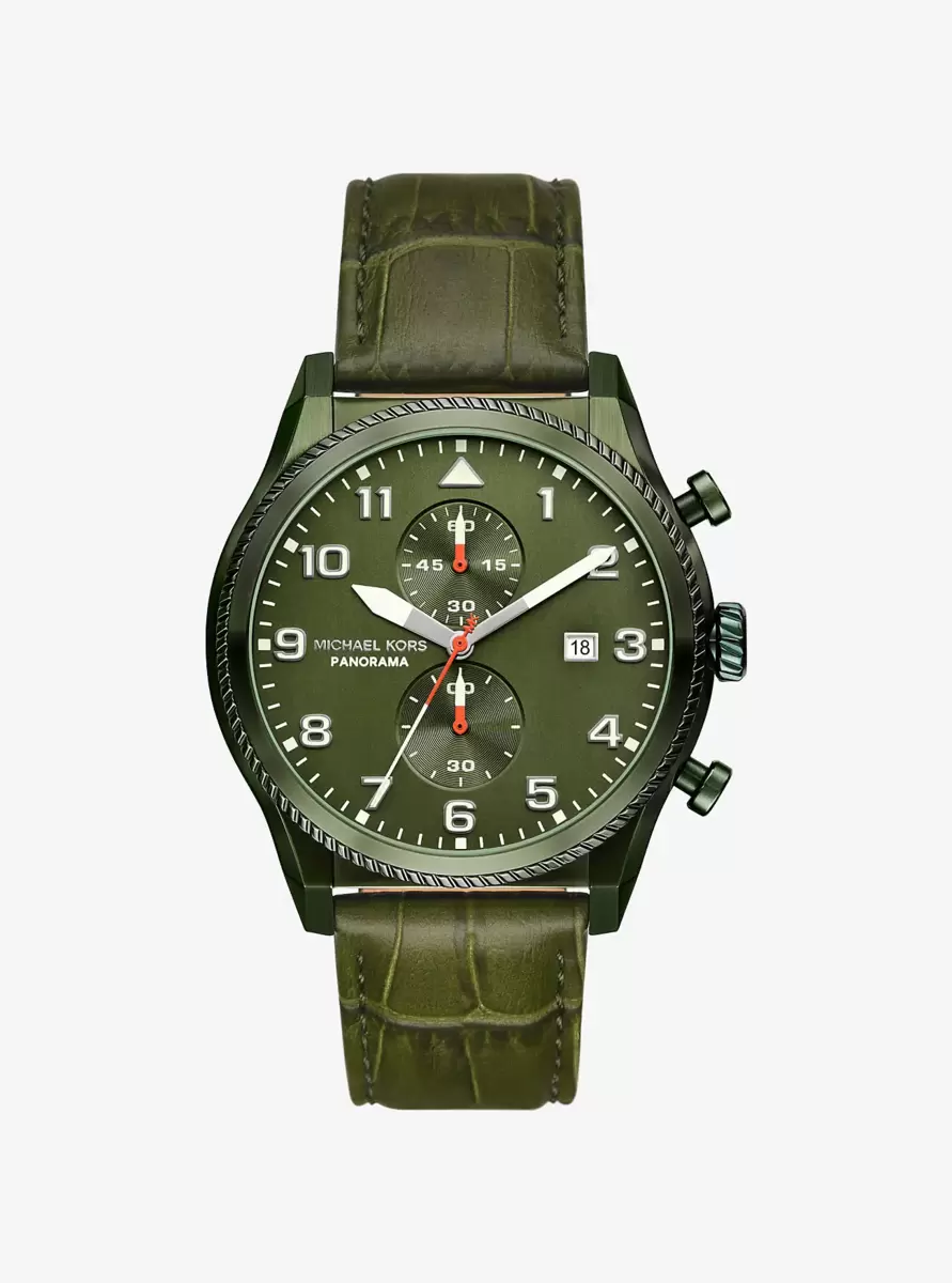 Übergroße Panorama-Uhr aus olivfarbenem Leder mit Krokodilprägung